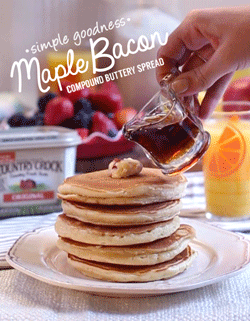 < Bacon makes breakfast better—especially when paired with sweet syrup in our delicious Maple Bacon spread! Add 3 slices of crisp, crumbled bacon to a 1/2 cup of Country Crock® and add in 2 Tbsp. of maple-flavored syrup. Use it on pancakes as an extra-special breakfast treat that’s perfect for birthdays, visiting guests or even that first morning back to school. Our new, simple recipe is made from real ingredients that will make you, and your family, love this indulgent treat even more.
